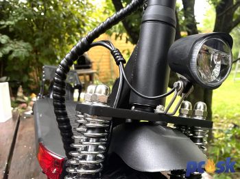Prečo výrobca použil vpredu štyri a nie dva tlmiče s pružinami, som sa nikde nedočítal. Môj názor je taký, že štyri tlmiče majú menšiu vôľu pri prenose váhy pri brzdení a štvorica slabších pružín má vo výsledku jemnejší chod ako dve silnejšie. Prax je taká, že pruženie a tlmenie funguje dobre a poradí si s našimi zvlnenými a deravými cestami. Neraz sa mi v zákrute stalo, že som prechádzal po zvlnenom asfalte a v duchu som sa modlil, nech mi neustrelí koleso do strany, no odpruženie kolobežky udržalo obe kolesá na ceste.