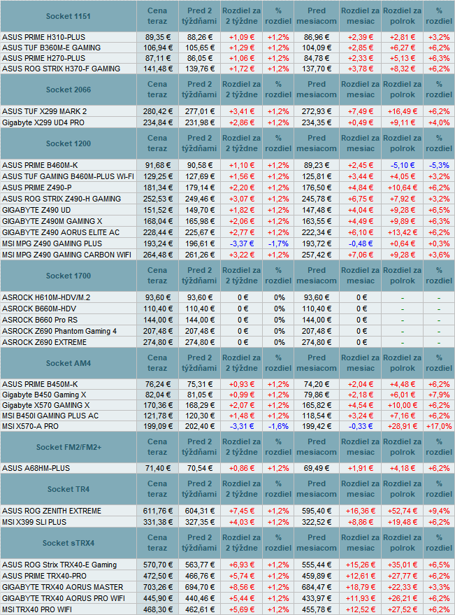 Ceny základných dosiek sa menili od +1,2% do -1,7%.