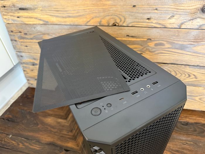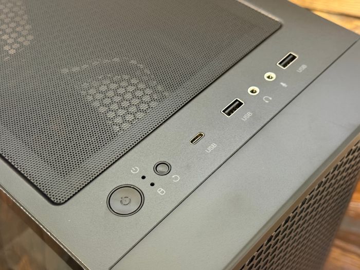 I/O panel skrinky je pomerne netradične roztiahnutý takmer po celej dĺžke skrinky – nachádza sa tu tlačidlo pre zapnutie, LED diódy (pre zapnutie a disk), USB C a dva USB-A rozdelené v strede jackom pre slúchadlá a mikrofón.