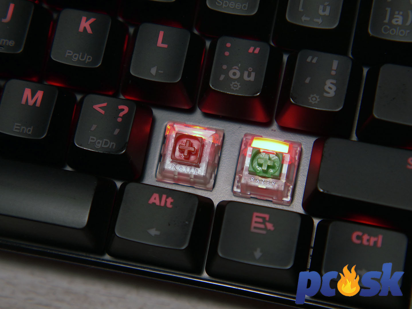 Dizajn spínačov a je kompatibilný s bežne používanými klobúkmi, takže výmena za iný typ nie je problém. Spínače sú meniteľné za chodu (hot-swap) a klávesnica je kompatibilná s inými typmi 3- a 5-pinových spínačov. Na obrázku nižšie môžete vidieť spínač od Razeru spolu s pôvodným spínačom Kailh.