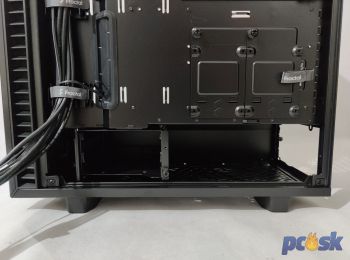 To, čo som nespomínal v predošlej kapitole je miesto pre disky, či už SSD alebo HDD. Do Define 7 Compact viete SSD disky umiestniť dokonca na tri miesta. Jedným z nich je perforovaný shroud pre zdroj kam sa zmestia dva disky.