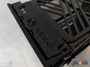 Prednej časti dominuje rebrovanie po bokoch predného panelu, ktoré slúži na nasávanie vzduchu – vlastne to je jediný prvok exteriéru, ktorý vybočuje z pomerne jednoduchého dizajnu skrinky. Zaujmú aj bezskrutkové bočnice, ktoré teraz držia na svojom mieste vďaka špeciálnemu držiaku, ktorý treba vytlačiť. Ten sa nachádza v hornej časti ľavej aj pravej bočnice.