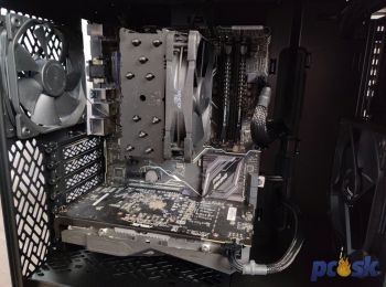 Do Fractal Design Define 7 Compact som sa rozhodol nainštalovať ATX dosku Asus so starším čipsetom Z170, chladič Noctua NH-U12S z edície Chromax a grafickú kartu RX 570 rovnako od Asus. Ako vidíte z fotiek, v skrinke ostáva stále dostatok priestoru pre väčšie komponenty – napríklad pre grafickú kartu. RX 570 meria len 240mm na dĺžku, do Define 7 Compact dostanete GPU o dĺžke až 341mm. Ak nepoužijete predný ventilátor, získate pre grafickú kartu ďalších 19mm.