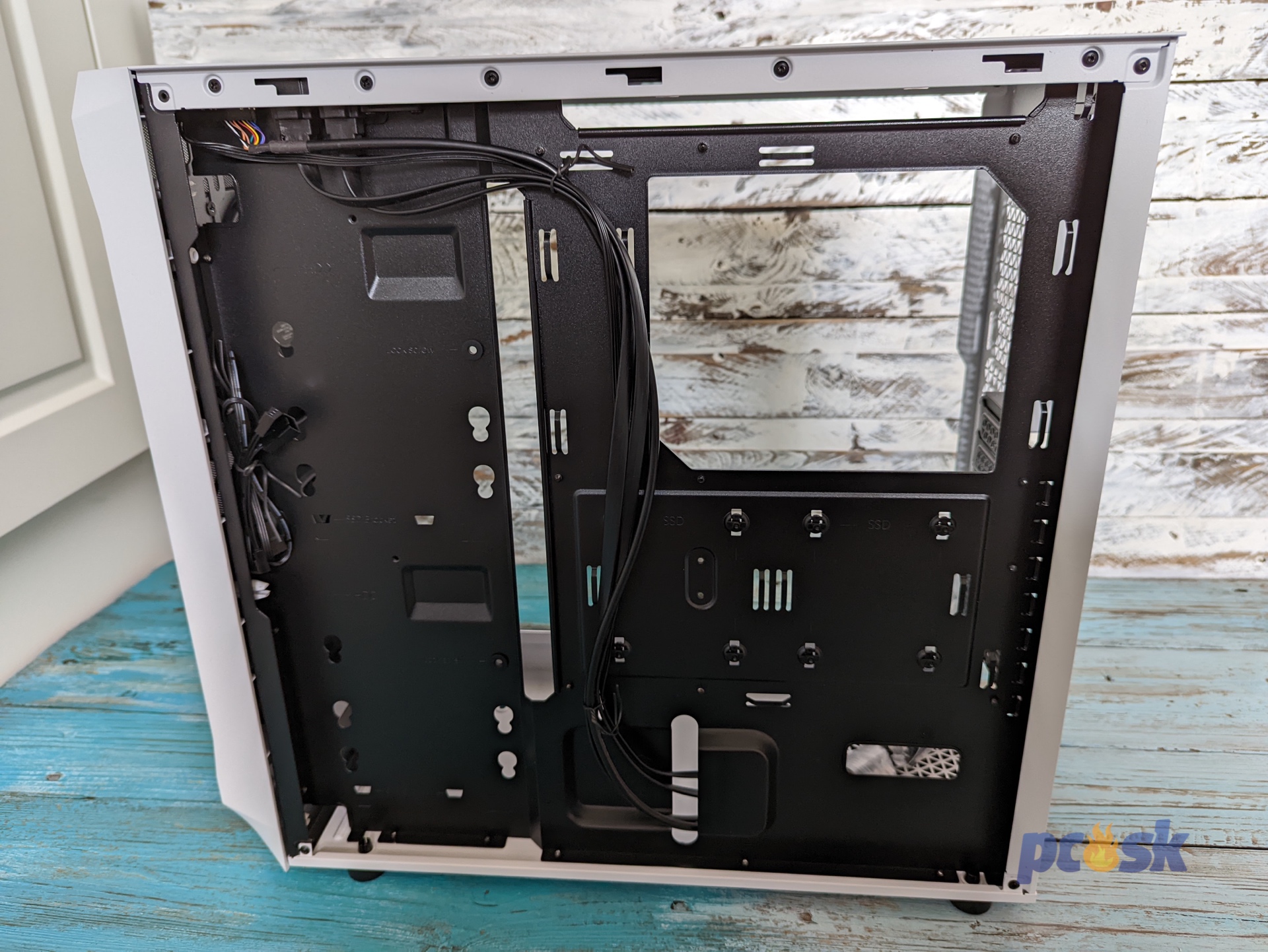 Prvá vec, ktorá vám udrie do očí, keď dáte dole sklenenú bočnicu je velikánsky priestor v skrinke. Nenachádza sa tu totiž žiaden shroud pre zdroj – niečo čo som nevidel už dlhší čas. Fractal Design prišiel z novinkou akého si mini shroudu, ktorý je pripevnení na samotnú bočnicu. Pri pohľade z boku, tento kus plechu uzatvára priestor okolo zdroja, avšak pri pohľade z hora, zdroj aj káble jednoducho vidíte. Celkovo však ide o celkom zaujímavé riešenie, ktoré má z časti zakryť zdroj a zároveň aj ponechať otvorený priestor v skrinke.