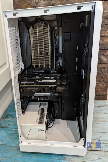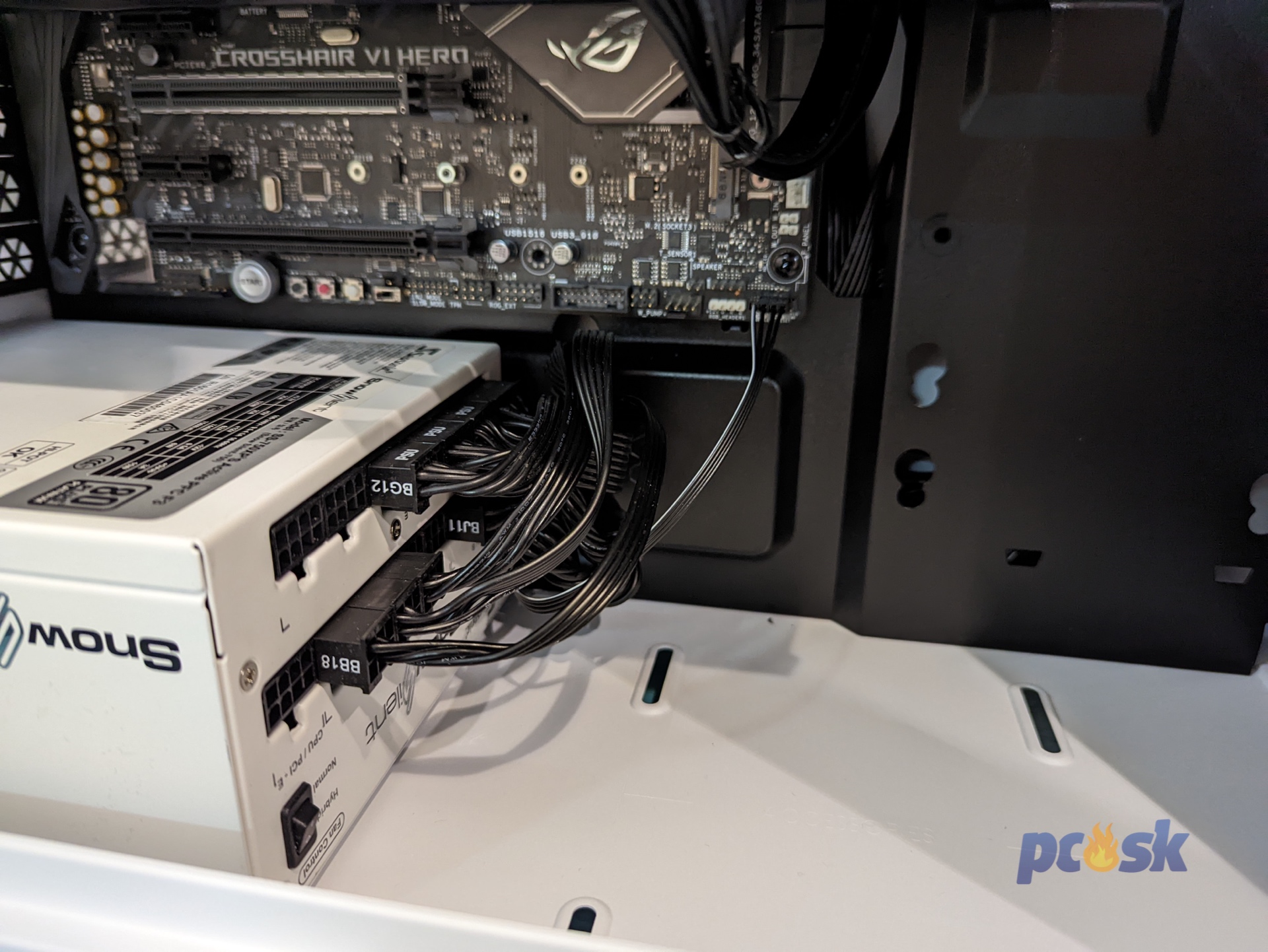 Namontovať dosku do skrinky nebolo príliš ťažké. Testovacia doska Crosshair VI Hero od Asusu sa sem zmestila bez problémov, rovnako ako grafická karta R9 390 Fury s dĺžkou 395mm – tej ostávala ešte kus voľného priestoru od predných ventilátorov. Ak sa trochu pohráte s káblami od zdroja, ktoré pekne zahnete alebo obalíte suchým zipom, ani nebude príliš vadiť, že sú viditeľné.
