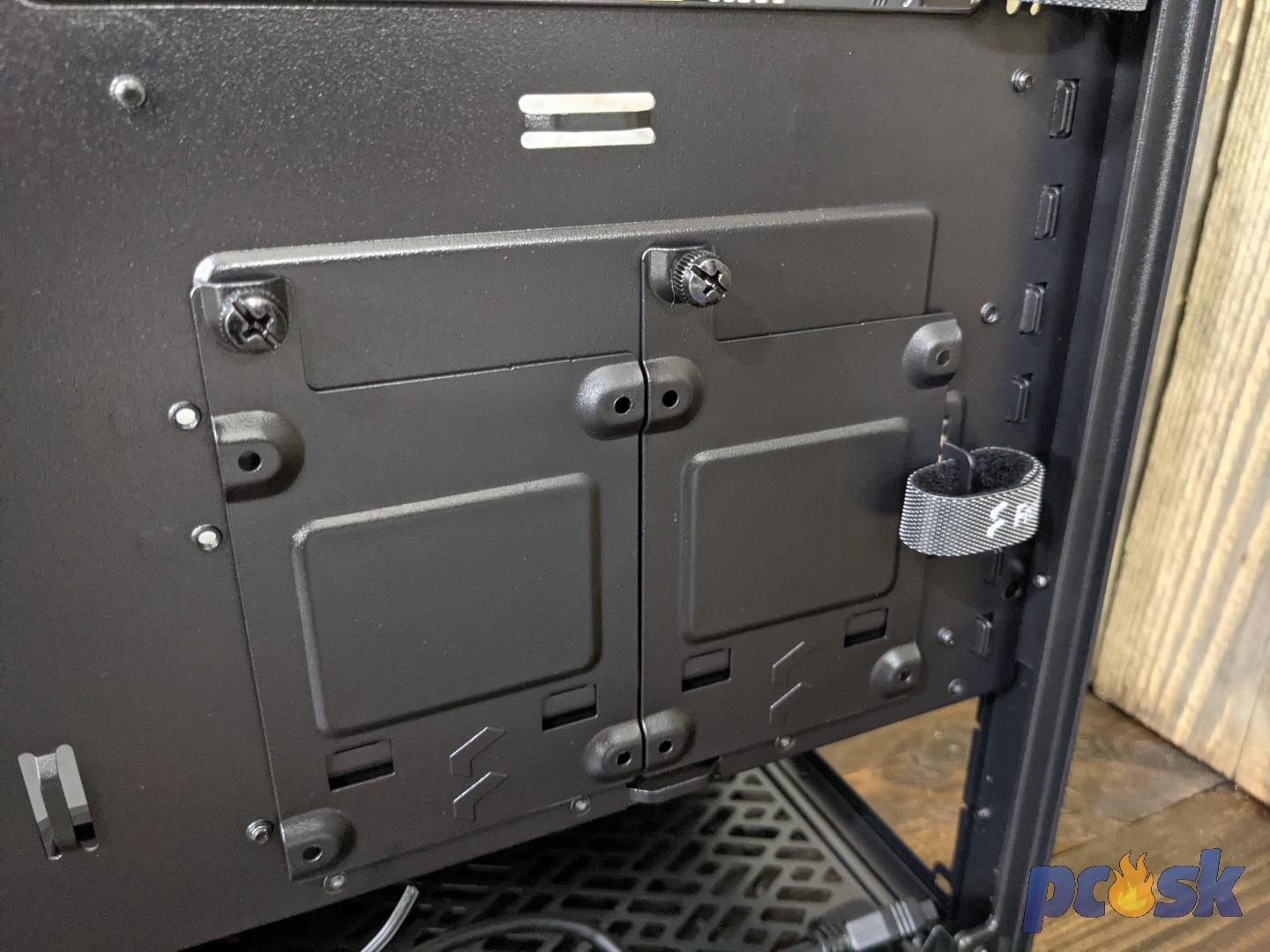 Keď skrinku otočíte, zistíte, že sa tu nenachádza žiaden hub pre ventilátory. Škoda, že práve toto nezdedil po Meshify 2 – stačilo ponechať aspoň malý hub pre 4 ventilátory. Pri menších skrinkách často býva problém s miestom pre káble od zdroja a riešením práve býva odstránenie koša pre disky. U Meshify 2 Compact toto nemusíte riešiť, klasický ATX zdroj (v mojom prípade Be Quiet System Power 9) sa sem zmestil bez väčších problémov. Ostalo tu ešte miesto na schovanie prebytočných káblov.