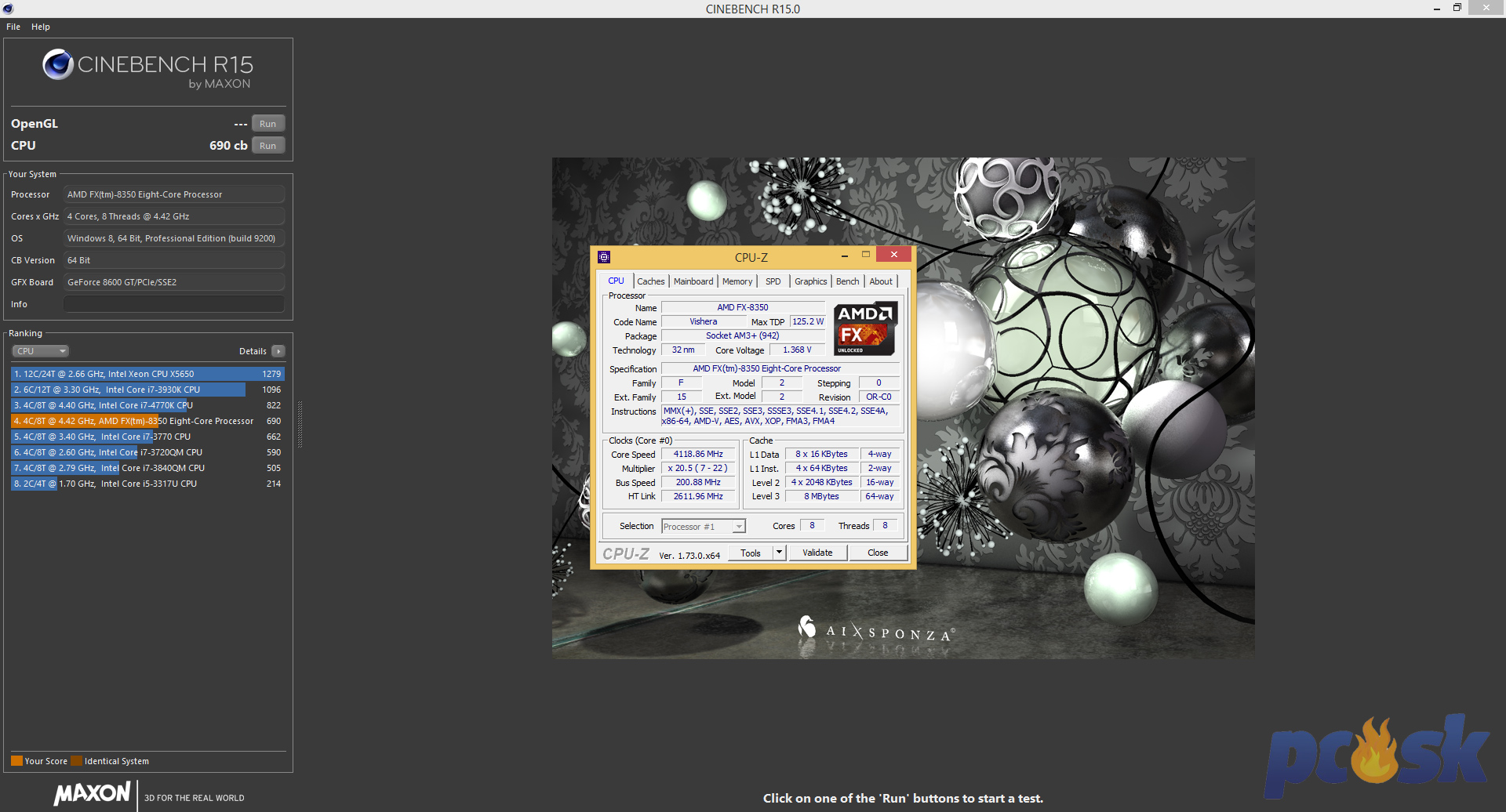 Základný takt procesora je 4GHz (20x 200MHz). Priznám sa, že taktovanie tohto procesora a vôbec AMD procesora som nerobil roky a tak som nevedel čo čakať. Vysoko som sa však nedostal a najvyššou frekvenciou, pri ktorej bol procesor ochotný prejsť testom Cinebench R15 bola 4,4GHz. 8 jadier na frekvencii 4,4GHz - to nie je zlé. Skóre v Cinebench poskočilo z 636b na 690b, čo je nárast o 8,5%.