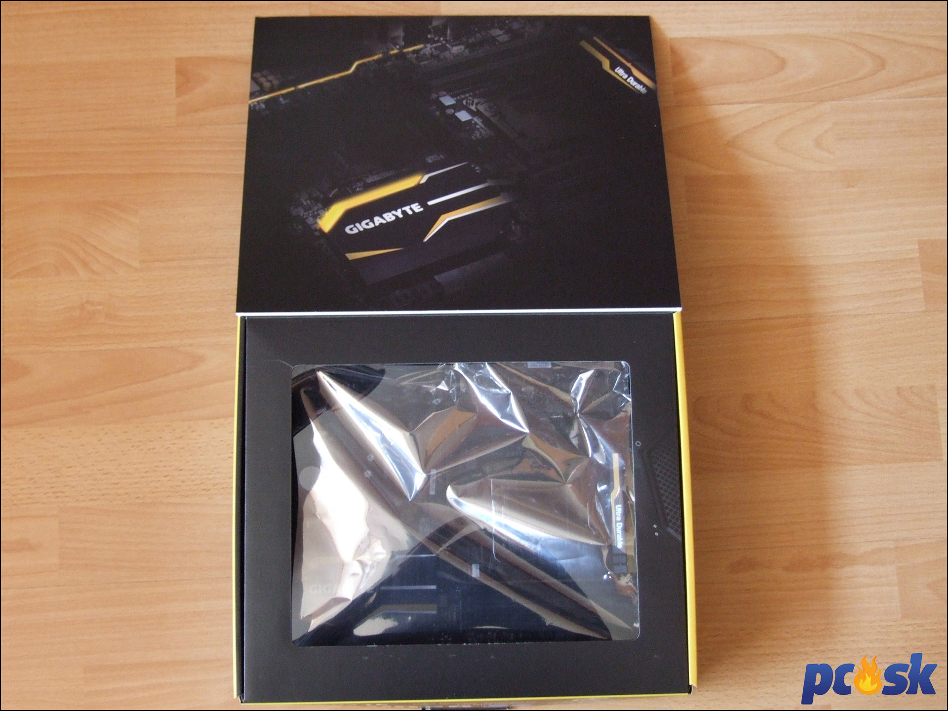 Teraz však už k samotnej doske. Začneme tradične balením. Krabica väčších rozmerov je vyvedená v peknom čierno-žltom sfarbení. Predné veko sa dá vyklopiť čím sa odhalí pohľad cez plastové "okno" na samotnú dosku. Zadná strana poskytne základné špecifikácie dosky a výpis hlavých funkcií s obrázkami.