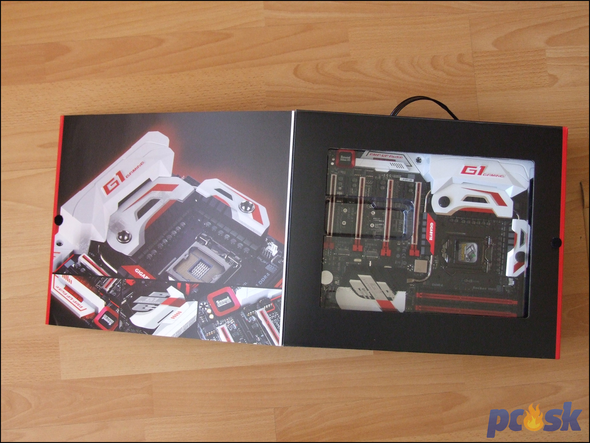 Ak si náhodou zakúpite túto základnú dosku, nielen že bude vaša peňaženka výrazne prázdnejšia, ale dorazí k vám obrovská krabica, či vlastne akýsi kufrík vážiaci bezmála 5kg. S jeho prenosom vám však pomôže praktické ucho na vrchnej strane. Predná strana zobrazuje logo G1 Gaming a dá sa odklopiť nakoľko ju drží jeden suchý zips. Jej odklopením sa odkryje pohľad na samotnú dosku zabalenú v izolovanej krabici. Odklopené veko zobrazuje iba detailné fotky niektorých častí dosky. Špecifikácie a funkcie dosky sú až na zadnej strane.