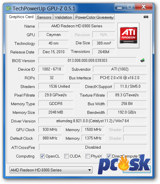 - AMD Radeon HD 6970 (880/1.375 MHz, 2 GiB GDDR5) @ WHQL 11.2