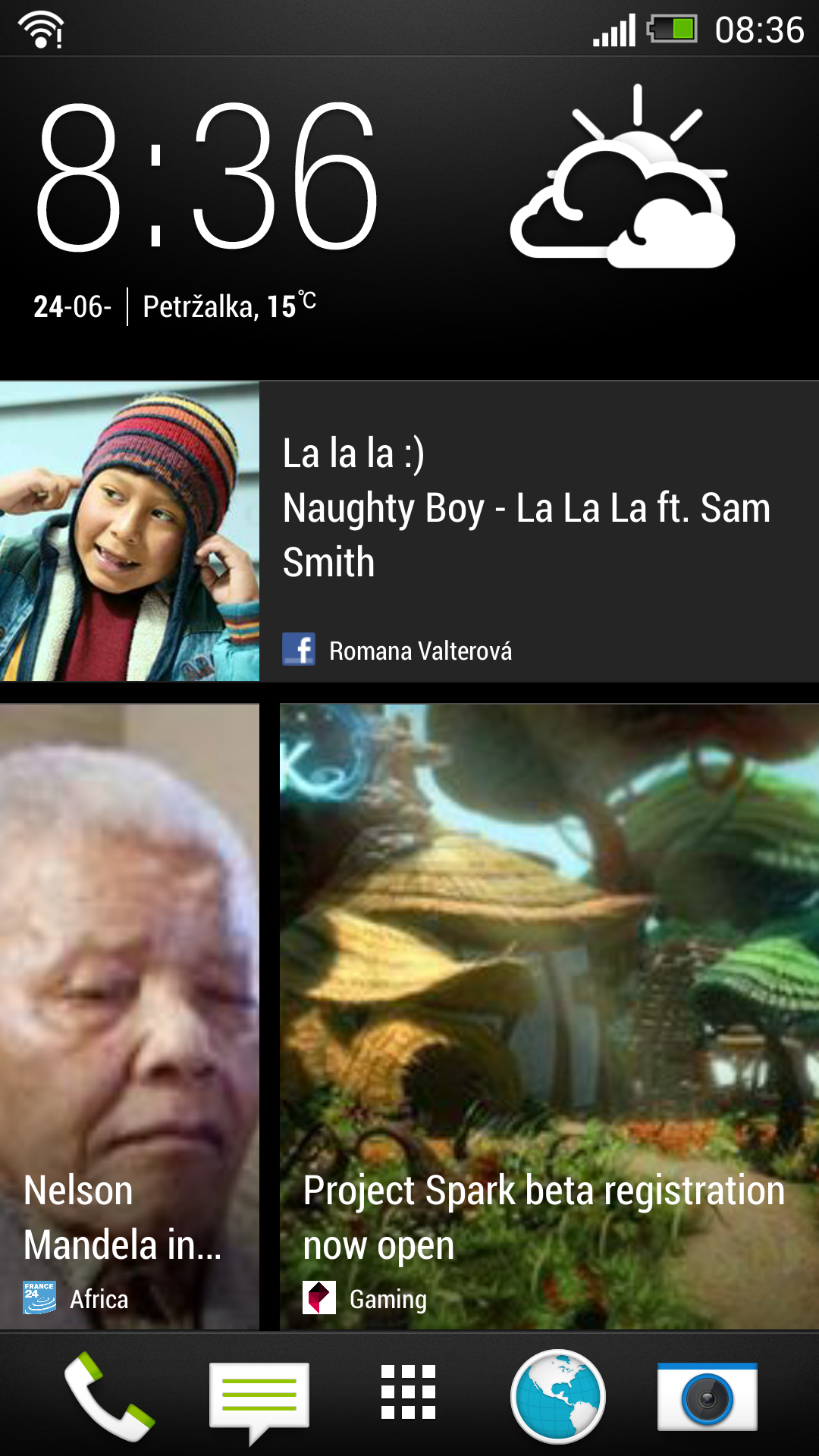 BlinkFeed je niečo, čo buď ihneď vypnete, alebo budete používať denne. Je skutočne na zamyslenie, čo z toho si vyberiete. Skôr to však závisí od osobných preferencií ako od toho, čo sa dočítate na internete. Každý má svoje potreby a ak ich dokáže za pomoci BlinkFeed uspokojiť, prečo nie? BlinkFeed Vám ponúkne momentálne unikátnu čítačku rôzneho obsahu z webu. Možno doň nahádzať skutočne veľa informácií, či už aktuality z Facebooku, Twittera, lokálne novinky, či novinky zo sveta, šport, politika, IT a mnoho iných kategórií. Možnosti nastavenia tohto obrovského widgetu sú skutočne široké. Je len na Vás, čo sa bude zobrazovať ihneď po odomknutí telefónu. Jednotlivé novinky sú uložené do dlaždičiek, ktoré možno posúvať smerom nadol. Zamyslím sa, kde sme niečo takéto videli? Windnows Phone J Tu máme jednoznačne inšpiráciu z tohto momentálne prekvitajúceho operačného systému. Samozrejme, bez výčitiek voči HTC. BlinkFeed je spracovaný skutočne dobre a mne osobne vyhovoval ako hlavný zdroj informácií. Ak však preberáte mnoho noviniek a správ, môže Vás neustále posúvanie dlaždíc dráždiť, čo sa po čase stalo aj mne.