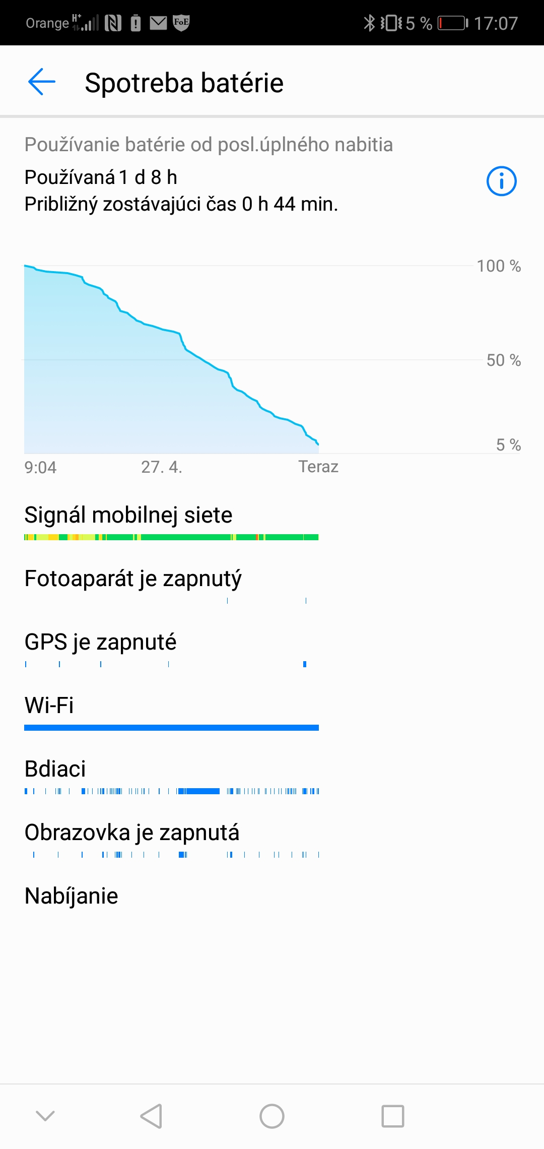 Huawei P20 Lite som používal ako svoje primárne zariadenie. Denne som pretelefonoval cca. 30 minút. Na pozadí bežali komunikačné aplikácie Skype, WhatsApp, Facebook a Messenger, ktoré neustále hlásili nejaké nové správy. V telefóne boli nastavené dve e-mailové kontá a na pozadí bežala aplikácia Spotify, ktorou si prepínam hudbu na PC. Počas dňa zvyknem spraviť niekoľko fotografií, pozriem približne 30 minút videí na Youtube a skontrolujem dopravnú situáciu cez Waze. V telefóne neboli zapnuté žiadne šetriace funkcie, jas displeja bol nastavený na automatický režim, zapnuté 4G mobilné dáta, WiFi a pripojený náramok cez Bluetooth.