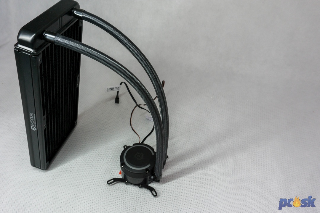 Blok CPU chladiča má kruhový tvar s RGB kruhom na jeho vrchu. Logo ID Cooling je rovnako podsvietené. Obe hadice (in/out) sú k bloku pripevnené z bočnej strany a dajú sa mierne rotovať. Z bloku „trčia“ dva kábliky – jeden je na pripojenie pumpy k doske a druhý pre RGB podsvietenie.