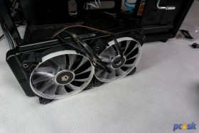 Radiátor hrúbky 27mm je úplne štandardný, ako sme mohli doteraz vidieť u ostatných chladičov. O chladenie radiátora resp. kvapaliny v okruhu sa postarajú dva 120mm ventilátory, ktoré sú rovnako podsvietené.