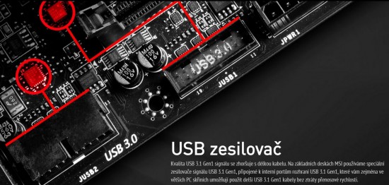 MSI myslelo aj na interné USB 3.1 Gen 1 konektory a pridalo k nim zosilňovače signálu, vďaka ktorým by nemal signál u dlhých káblov tak degradovať. Tento prvok mi príde tiež ako trochu zbytočný, neviem si predstaviť, že by niekto použil tak dlhý kábel, že by sa mu strácal signál. Oficiálna špecifikácia USB 3.0/3.1 neuvádza maximálnu dĺžku kábla, odporúča sa však použiť maximálne 3m.