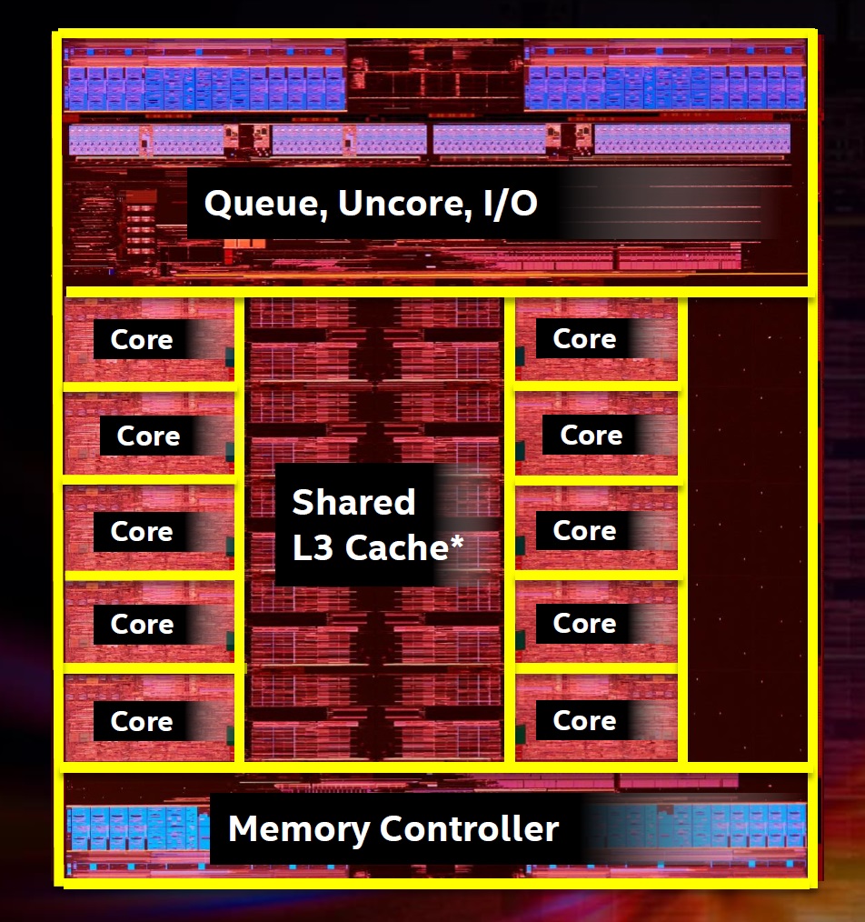 Detailný pohľad na die samotného procesora neodhalí žiadne dramatické zmeny. Pribudli 2 jadrá a adektávne k tomu narástla L3 cache o 5MB.