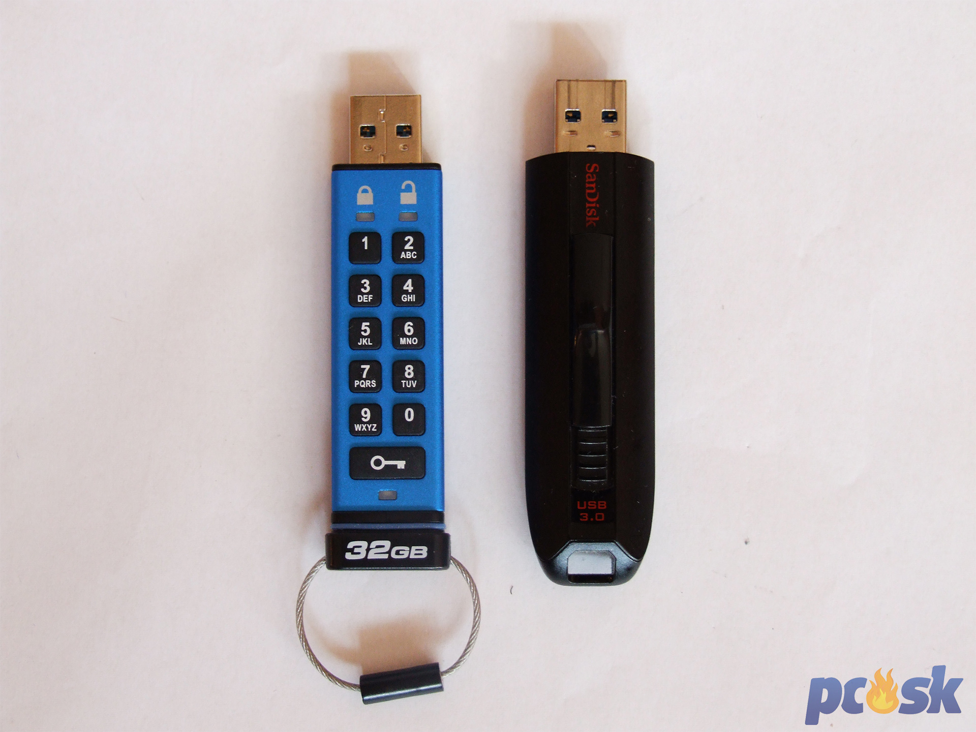 Samotný kľúč je taktiež z belasého hliníka a je pomerne veľký. Môže za to fakt, že okrem pamätí schováva 3,7V/40mAh batériu. Tá je tam na to, aby bolo možné odomknúť kľúč a použiť ho takže ak sa vám vybije batéria, máte smolu, kľúč neodomknete. Na to je však jednoduché riešenie nakoľko ak idete kľúč použiť znamená to, že ho idete pripojiť k USB portu nejakého zariadenia. To zároveň dobíja baterku v kľúči takže ihneď po zasunutí je možné zadať heslo a kľúč odomknúť.