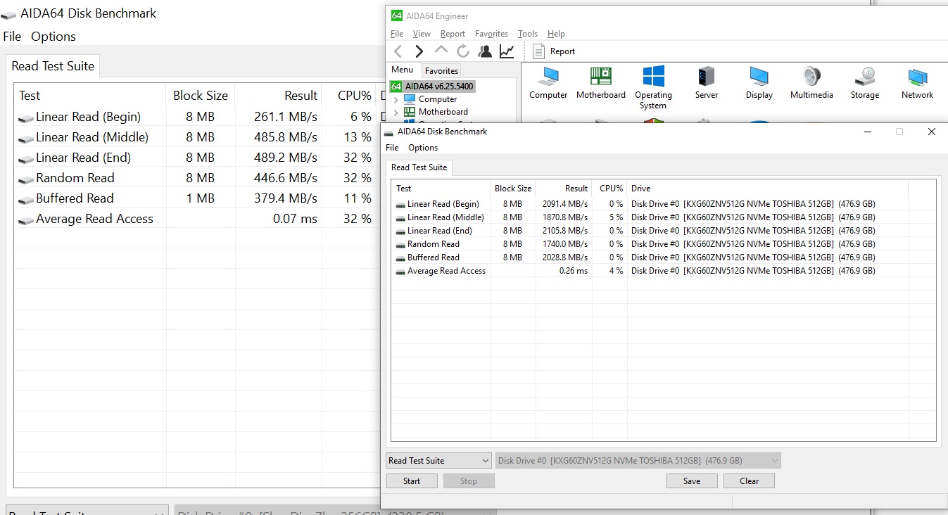 Disk bol pre mňa veľký otáznik, predsa len ide o čínskeho výrobcu, presnejšie ide o disk s označením: ShanDianZe. Disk som teda porovnal voči 512GB SSD Toshiba, ktorý mám v spomínanom Dell XPS 9380. Na test som použil AIDA 64 Engineer edition a benchmark na disk, ktorý otestuje viacero atribútov naraz.