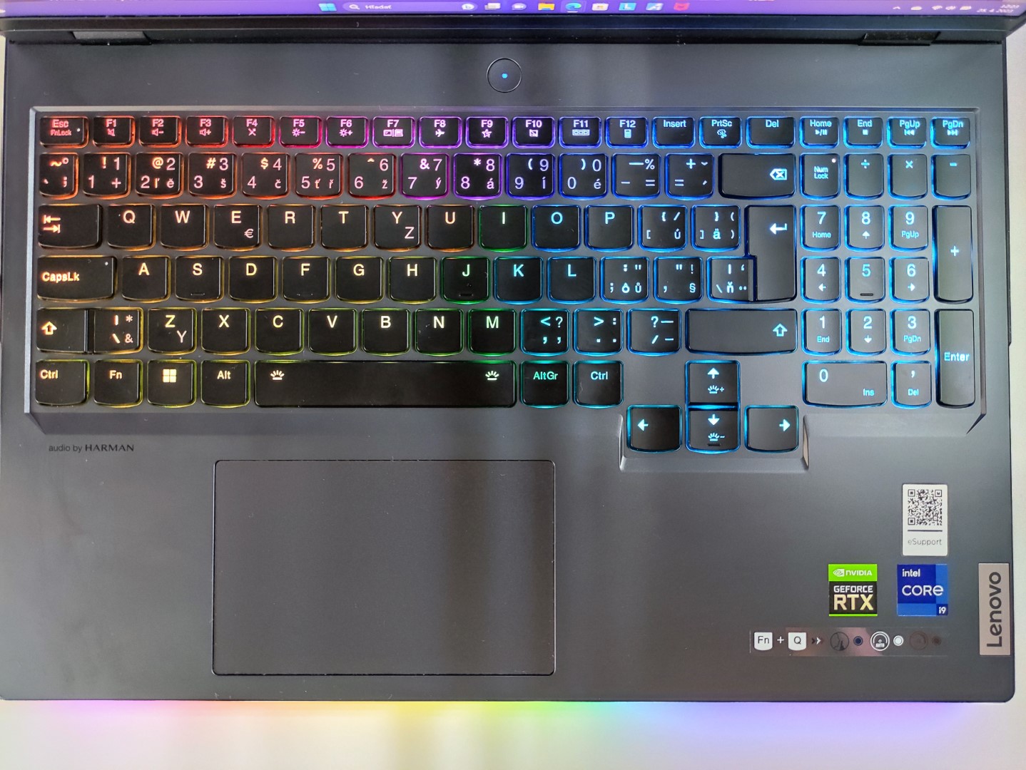 Po zapnutí "Legionu" sa hneď dostavil "wau" efekt v podobe rýchlosti štartu notebooku, krásneho displeja a RGB podsvietenia klávesnice. Tá ponúka až šesť režimov zmeny podsvietenia: