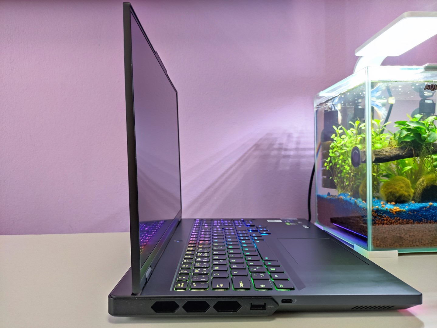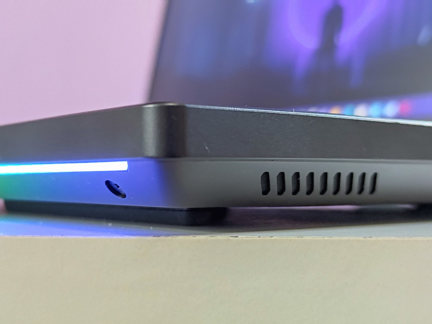 Spodná časť notebooku je teda o niečo väčšia, než tá vrchná. Spodnú hranu zdobí RGB pásik smerujúci na stôl. Po pravej strane nájdete od spodnej hrany 3,5 mm audio konektor a manuálny prepínač pre zapnutie/vypnutie webkamery. Potom nastupuje mierne vystúpená čierna plastová časť, ktorá obsahuje USB-A konektor a tri prieduchy chladenia a v rámci ohybu prechádza na zadnú stranu. Tam tiež nájdete tri prieduchy pre chladenie. Následne čierny plast končí a nastupuje naspäť matne šedý hliník obsahujúci výrezy pre RJ45 konektor, USB-C, HDMI, dva USB-A konektory a nabíjací konektor. Pri poslednom konektore nastupuje rovnaký plastový diel, ako na druhej strane a obsahuje po oboch stranách po tri prieduchy na chladenie. Ľavá strana obsahuje už len jeden USB-A konektor a jeden USB-C konektor.