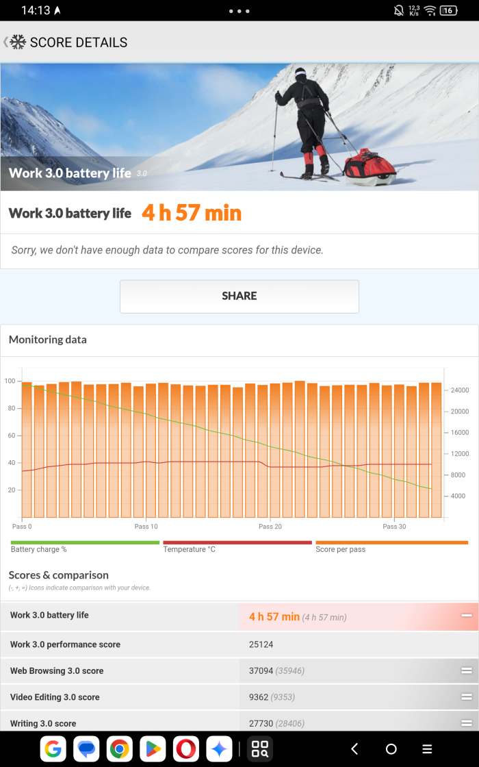 Výdrž batérie je adekvátna veľkosti a výkonu - pri intenzívnom hraní vydrží tablet približne 4 až 5 hodín, čo by mohlo byť o niečo lepšie, ale dá sa to zniesť. Pri multimédiách, kancelárskej práci či prehliadaní webu, tablet dokáže vydržať aj celý deň, čo robí z Legion Tab pomerne univerzálne zariadenie napriek jeho hernej orientácii. Kompletné nabitie z 0 na 100% trvá asi 75 minút, čo bude pre väčšinu používateľov dostatočne rýchle.
