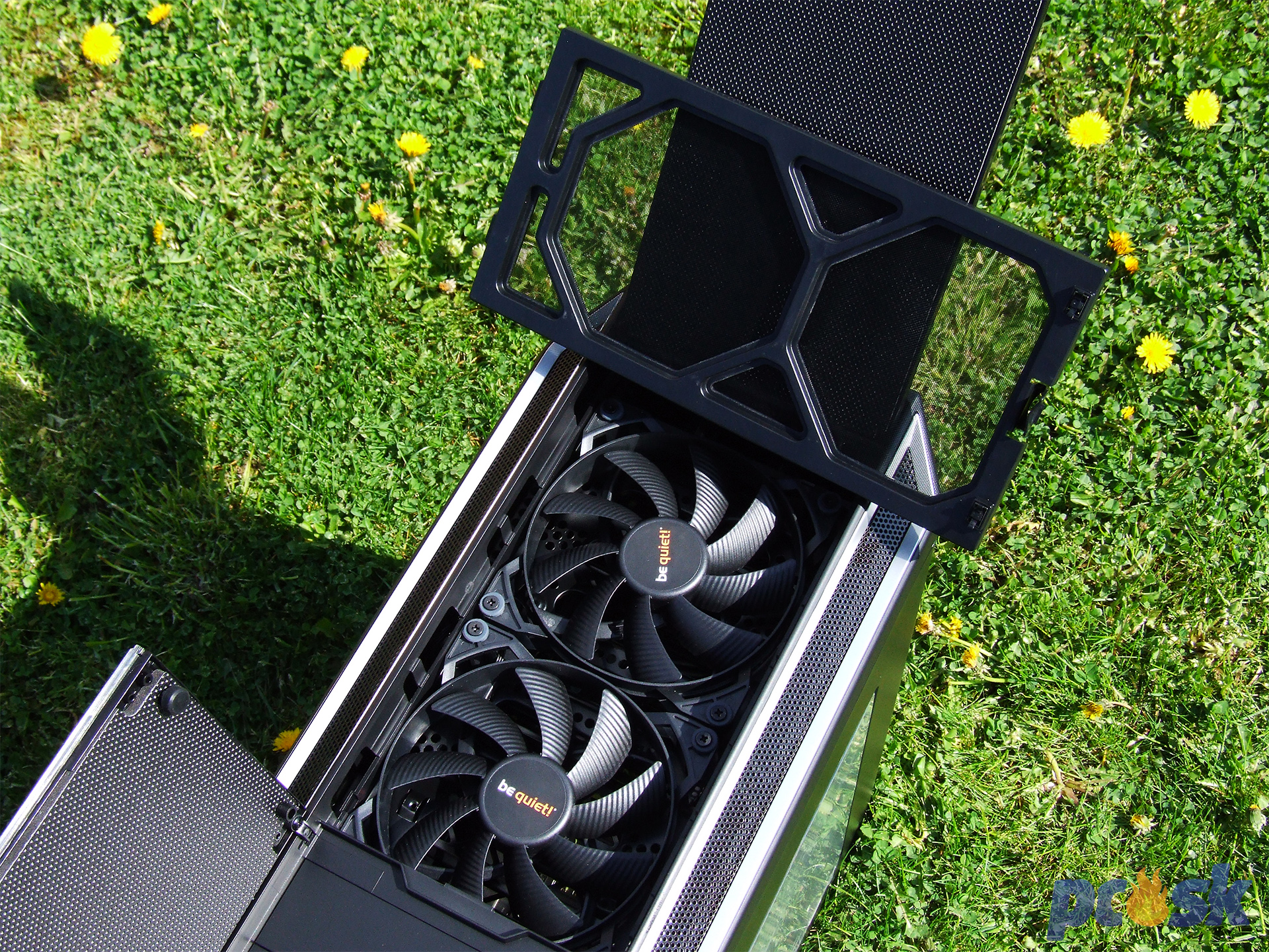 Pre ukážku poskytnem aj zábery predného panelu skrinky, ktorý je zaujímavý. Zložený je z 2 dvierok. Horné sa otvárajú do boku a schovávajú šuflíky pre 5,25“ mechaniky. Tieto dvierka je možné odmontovať. Spodné dvierka sa otvárajú zhora nadol a obsahujú protiprachovú ochranu, ktorú je možné odobrať. Za ňou je už dvojica 140mm ventilátorov.