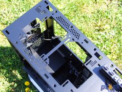 Keď už som začal s prvým ventilátorom, nahodím rovno aj druhý. Ten ide tentokrát hore, kde sa vmestia až dva 140/120mm ventilátory, alebo radiátor vodného okruhu. Pre montáž tohto ventilátora je taktiež potrebné zložiť horný plastový kryt. Ten už nie je priskrutkovaný, stačí zvnútra uvoľniť 6 plastových jazýčkov a kryt sa uvoľní. Po uvoľnení však s ním prudko nemykajte, k zvyšku skrinky ho držia totiž ešte káble, ktoré by ste mohli odtrhnúť. Toto samozrejme nie je prípad každej skrinky, no treba na to myslieť.
