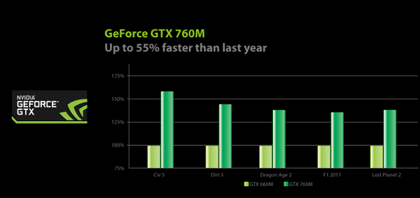 Nvidia GTX760M je kartou vyššej strednej triedy pre notebooky, ktorá podporuje DirectX 11. Karta používa chip GK106, avšak medzi jej slabiny patrí pomerne úzka dátová zbernica - len 128 bitov. Má768 CUDA jadier a vo full HD rozlíšenía s plnými detailami zvláda aj hry ako Call of Duty Modern Warfare 3. „Sedmičkový rad“ kariet od Nvidie ponúka dovedna päť výkonnejších čipov. Papierovo „naša“ karta žerie 55 wattov a je vyrobená 28 nm technológiou.