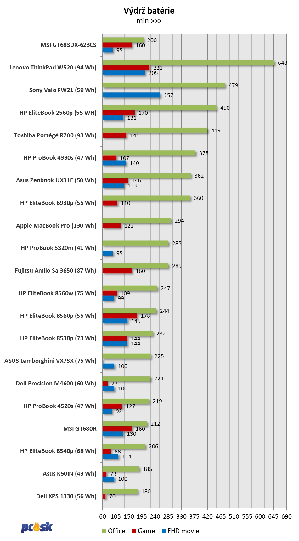 Ruku na srdce, čo by ste čakali pri tejto disciplíne od takejto zostavy? Aj napriek veľkému výpočtovému, ale aj hernému výkonu sa GT683DX nedala zahanbiť! Výdrž v našom redakčnom teste popravde prekvapila. Namerané výsledky boli nasledovné.