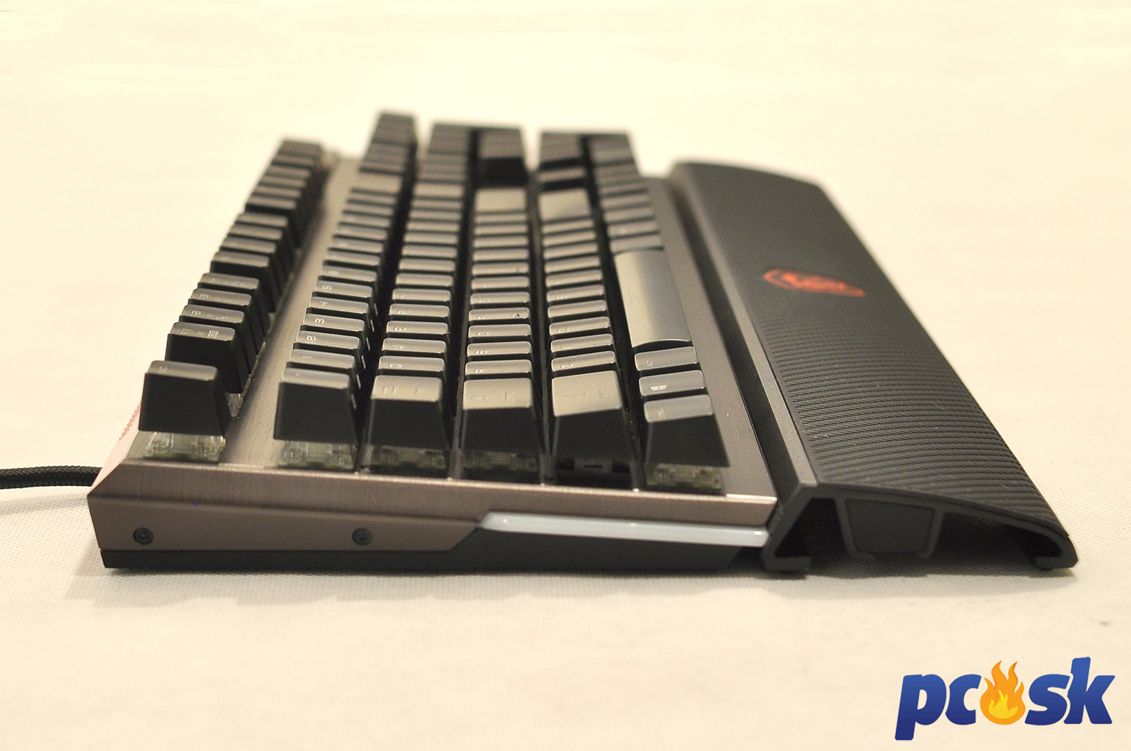 Súčasťou balenia je aj opierka pod zápästia s textúrovaným gumeným povrchom. Tá však nemá možnosť pripojenia ku klávesnici, ale jej umiestnenie je úplne na vás. Výhodou je tak jej polohovateľnosť tak aby vyhovovala presne vášmu zápästiu. Nevýhodou je jej pohyb po stole aj napriek protišmykovým podložkám. Aj keď sa to spočiatku nezdá, počas hrania mi vždy viac či menej posunula po stole.