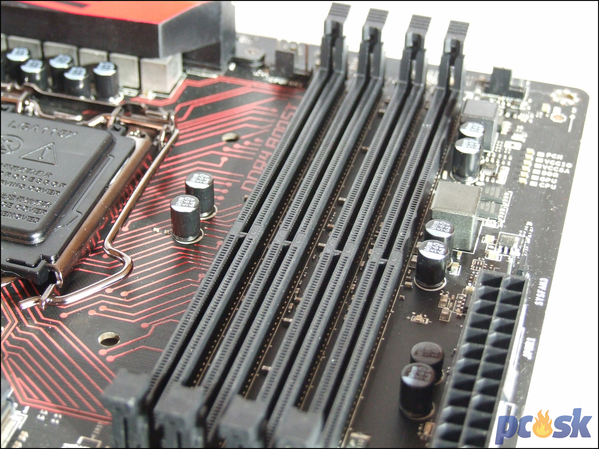 PCB dosky je čierne a ako tomu u MSI dosiek býva, prevahu čiernej „kazia“ iba červené prvky na pasívoch. Pasív nad PCH je pomerne veľký a okrem značky obsahuje aj červeného draka. Revízia PCB v našom teste bola 1.1 a PCB má 4 vrstvy. Zadná strana nenesie nič čo by stálo za zmienku, odhalí však pevne prichytenie pasívov cez skrutky.