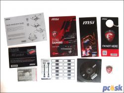 Príslušenstvo je ako sa na cenovú kategóriu patrí bohaté. Okrem povinnej literatúry v podobe niekoľkých manuálov tu máme aj štedrú kabeláž v podobe 6 SATA káblov a dvojicu Wi-Fi antén spoločne s Wi-Fi modulom. MSI dokonca pribaľuje aj niekoľko skrutiek a imbusový kľúč pre montáž. Tieto skrutky a podložky slúžia pre bezpečnejšiu montáž do skrinky a vzhľadom na červenú farbu podložiek ich niekto môže považovať aj za dizajnový minidoplnok.
