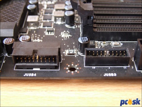 Ideme ďalej v spodnom okraji a narazíme na dvojicu interných USB 2.0 konektorov. Ďalej naľavo sú už len 2 konektory pre systémové ventilátory a JAUD1 konektor, čo je v podstate AAFP konektor pre vyvedenie zvuku na predný panel.