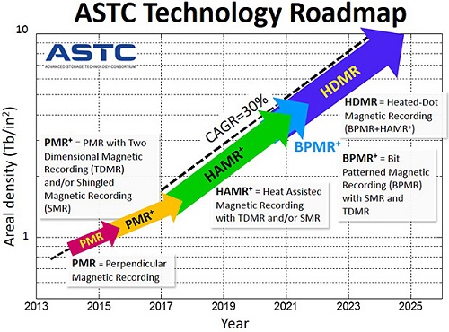 O takéto vysoké číslo sa postará Advanced Storage Technology Consrortium (ASTC), ktoré tvorí HGST, Seagate a WD. ASTC uvoľnilo poslednú roadmapu, podľa ktorej sa v roku 2025 dočkáme pevných diskov s kapacitou 100TB vďaka HDMR technológii.