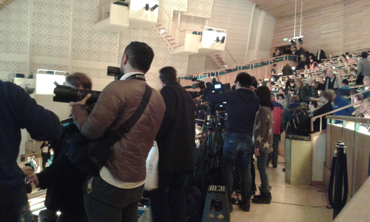Tento rok sa prednášky za fyziku, chémiu, biológiu a ekonomiku konali minulý utorok 8. decembra. Aj keď je začiatok prvej prednášky o 9:00, oplatí sa privstať si a prísť skôr. Už o štvrť na deväť je pred Aulou pomerne dlhá rada. V Štokholme zapadá Slnko v decembri už krátko po pol tretej poobede a vychádza ráno o pol deviatej. V rade ráno budete stáť už v rannom brieždení. Dnu sa veľmi pravdepodobne dostanete aj keď prídete len 5 minút pred začiatkom, no najlepšie miesta úplne vpredu už vtedy určite nezískate.