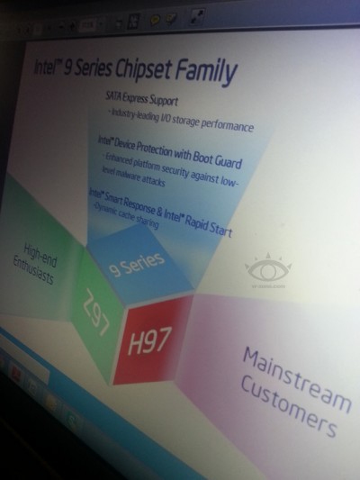 Ako vidno na uniknutom slajde, počítať môžeme minimálne s dvoma chipsetmi - luxusnejším Z97 a mainstreamovým H97. Ich spoločným rysom je podpora SATA Express, technológie Intel Device Protection s ochranou pred škodlivým kódom pri bootovaní a technológiami zameranými na SSD caching - Smart Response a Rapid Start, zmáne z platforiem Z68 a Z77.