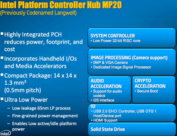 PCH MP20 (Langwell) - tzv. "čipset" k procesoru, ktorý sa stará o USB 2.0 a HDMI konektivitu, zabezpečuje tiež správu NAND pamätí (až do 80MB/s) a podporuje dve videokamery (1x 5Mpix a 1x VGA rozlíšenie). Je vyrábaný 65nm procesom u TSMC.