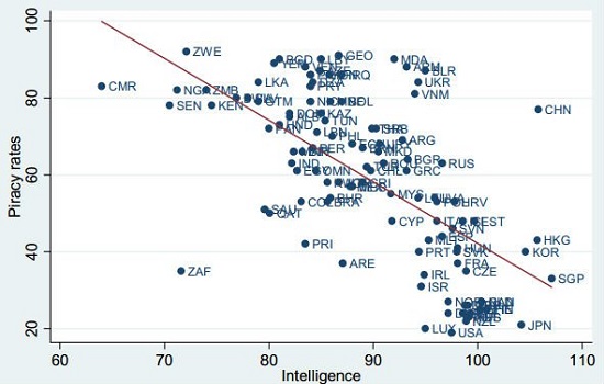 Nový výskum vedcov zistil, že miera pirátstva softvéru je priamo spojená s inteligenciou národa. Menej inteligentné národy sťahujú viac ilegálneho softvéru ako tie inteligentné.