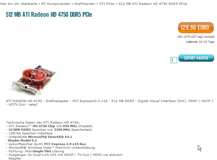 Poslednou novinkou je prvé zaznamenanie grafickej karty Radeon HD4750 v cenníku obchodu - nemecký predajca ju zaradil do svojej ponuky za 129,90 €: