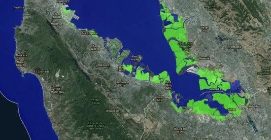 Zelenou farbou sú vyznačené oblasti San Franciscého zálivu, ktoré budú do konca storočia zaliate vodou