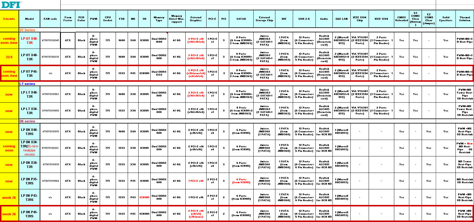 Z tabuľky sa popri základných špecifikáciách dozvedáme aj plánovaný čas uvedenia na trh - DFI LP DK P45-T2RS by sa mala objaviť v 26. týždni, verzia T3R bližšie nešpecifikovane v júni.
