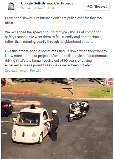 „Príliš pomalé šoférovanie? Stavím sa, že ľudia za to nie sú zastavovaní príliš často“, napísal Google na margo toho, že ich samojazdiace auto zastavila polícia kvôli pomalej jazde.