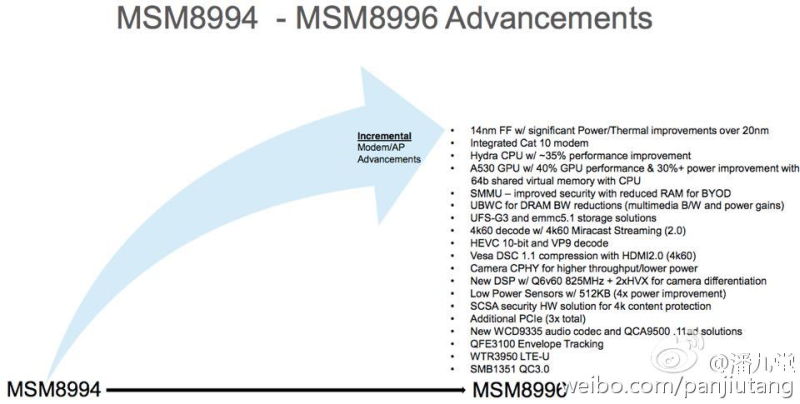 Nový procesor pre smartfóny a tablety má meno Snapdragon 820, ale stretávať sa s ním budeme aj pod prezývkou MSM8996. Na rozdiel od predchodcu Snapdragon 810, ktorý používal 20nm výrobnú technológiu, u novinky použije Qualcomm 14nm FinFet proces. SoC však nebude mať 8 jadier, ale 4 jadrá ARMv8 s označením Hydra. Napriek polovičnému počtu jadier sľubujú tieto štyri 64-bitové jadrá asi 35%-ný nárast výkonu. O grafiku sa postará Adreno 530, ktorá sľubuje až 40%-ný nárast vo výkone a 30%-nú úsporu energie. Či ide iba o prehnané výplody marketingového oddelenia alebo realitu uvidíme už čoskoro.