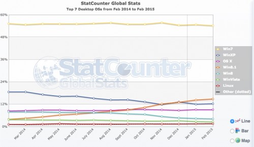 Podľa Statcounter má najväčší podiel stále Windows 7, ktorý používa 54,13% užívateľov. Rekordné hodnoty dosahoval Windows 7 minulý rok, no aj tak si stále drží slušný podiel. Windows 8.1 stúpol z 14,27% z januára 2015 na 14,78% vo februári.
