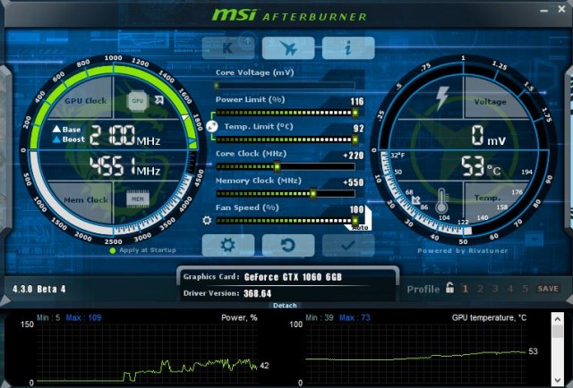 Kartu je možné bez problémov prevádzkovať so znížením TDP až o 15%. Pri niektorých náročnejších hrách bolo nutné zdvihnúť TDP aspoň na 75%, aby karta udržala takt 1,79 GHz. Vo všeobecnosti sa nad hodnotu 90% TDP karta prakticky nedostala. Ide o výbornú hodnotu. Karta je v takomto prípade ešte tichšia a vôbec nekúri. Ak nebudete taktovať, odporúčam znížiť TDP. GTX 1060 je karta vhodná do HTPC, spotreba pri zníženom TDP ide rapídne dolu.