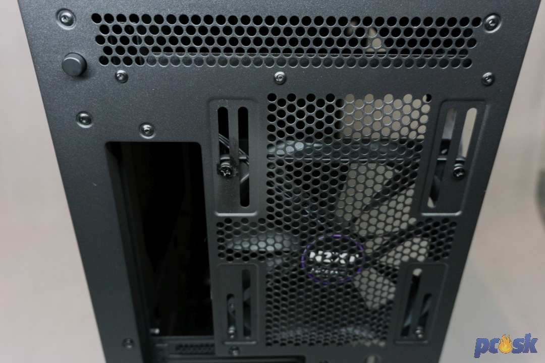Do zadnej časti môžete nainštalovať 120 alebo 140mm ventilátor, ktorý je polohovateľný. Mriežka za ventilátorom je mierne vypuklá, čo by malo pomôcť ventilátorom so slabším statickým tlakom. Celková kvalita skrinky je naozaj dobrá a samotná konštrukcia je veľmi pevná.