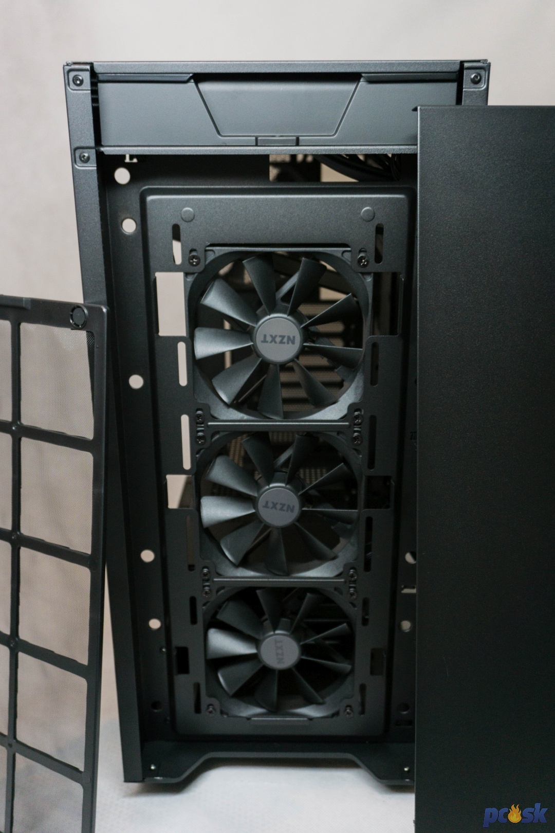 Predný aj horný panel skrinky je plochý bez výstupkov či dierovania. Pre ventilátory sú tu nachystané otvory pre nasávanie a vyfukovanie vzduchu, ktoré sú po ich bokoch. Predná časť, v ktorej sa schovávajú tri 120mm ventilátory, je chránená voči prachu jemných prachovým filtrom. Ten drží na svojich miestach vďaka magnetom.