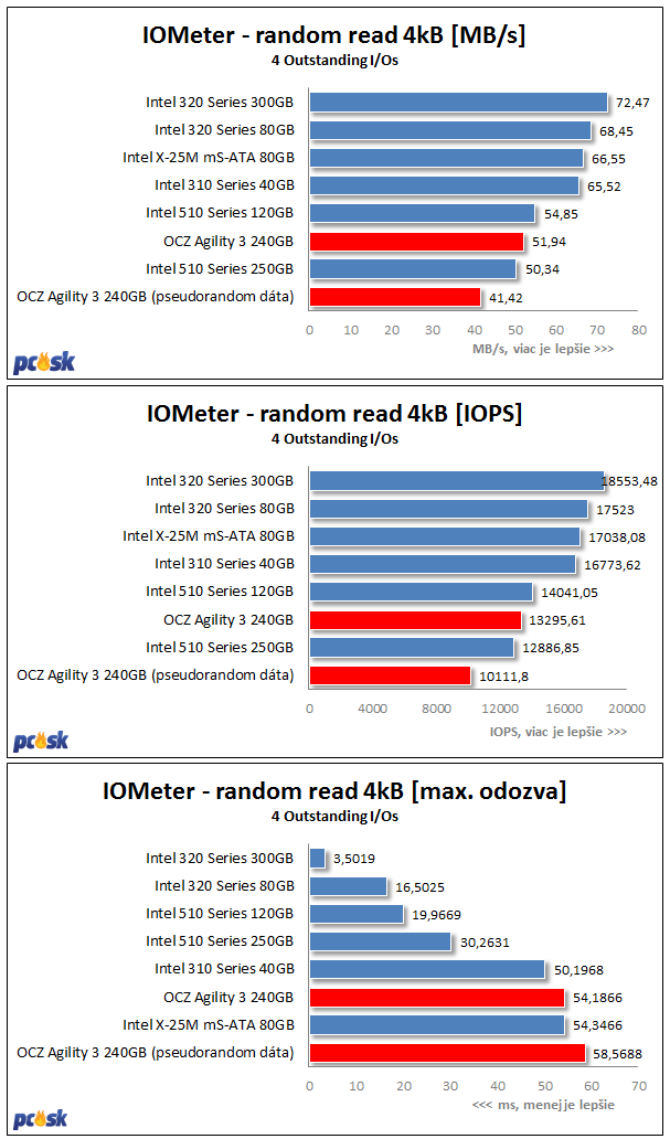 Testovanie náhodných operácií s nástrojom IOMeter spočíva v nastavení 100% náhodnosti a taktiež 100% čítania 4kB veľkých dátových blokov. Meria sa s hodnotami Outstanding I/Os 4, čo predstavuje miernu záťaž pre disky (ako napríklad menšie aplikácie typu Windows Kalkulačka) a 32 I/Os, čo už je prípad náročnejších aplikácií s viacerými prístupmi na disk. Zaujíma nás celková priepustnosť v MB/s, počet operácií za sekundu (známy parameter IOPS ktorý uvádzajú aj výrobcovia SSD) a taktiež maximálna nameraná odozva. Táto je dôležitým ukazovateľom, pretože vysoké hodnoty môžu znamenať občasné „trhanie“ v systéme. Pár desiatok milisekúnd je výborný výsledok, ale hodnoty okolo 1000ms už sú závažnejšie.