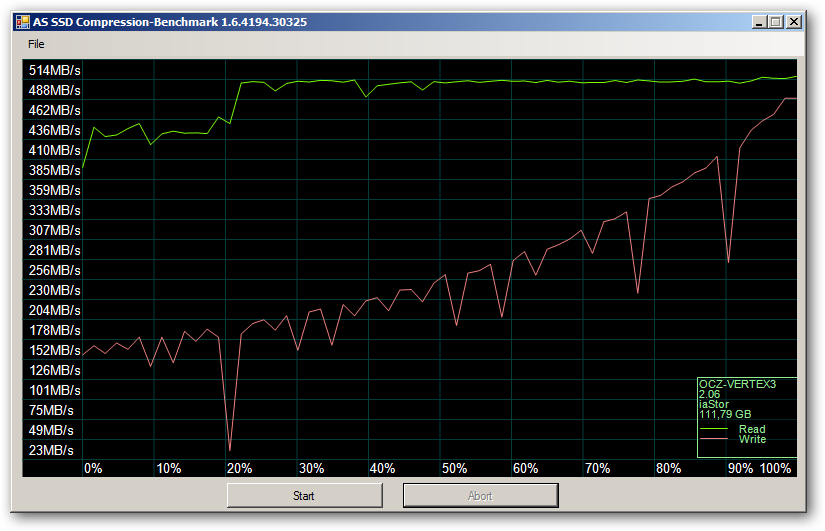 AS-SSD v poslednej verzii obsahuje aj test Compression Benchmark. Tento overuje rýchlosť SSD pri rôznej úrovni komprimovateľnosti dát. Pri porovnaní s Agility 3 240GB, ktoré má asynchrónne pamäte vidieť rozdiel v prospech Vertex-u, čítanie je v podstate skoro v celom spektre na maxime.