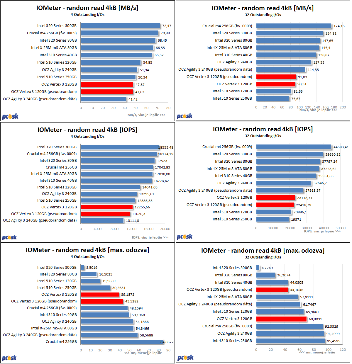 Testovanie náhodných operácií s nástrojom IOMeter spočíva v nastavení 100% náhodnosti a taktiež 100% čítania 4kB veľkých dátových blokov. Meria sa s hodnotami Outstanding I/Os 4, čo predstavuje miernu záťaž pre disky (ako napríklad menšie aplikácie typu Windows Kalkulačka) a 32 I/Os, čo už je prípad náročnejších aplikácií s viacerými prístupmi na disk. Zaujíma nás celková priepustnosť v MB/s, počet operácií za sekundu (známy parameter IOPS ktorý uvádzajú aj výrobcovia SSD) a taktiež maximálna nameraná odozva. Táto je dôležitým ukazovateľom, pretože vysoké hodnoty môžu znamenať občasné „trhanie“ v systéme. Pár desiatok milisekúnd je výborný výsledok, ale hodnoty okolo 1000ms už sú závažnejšie.